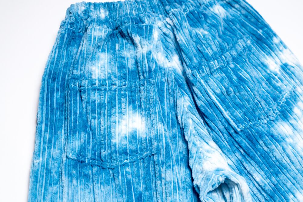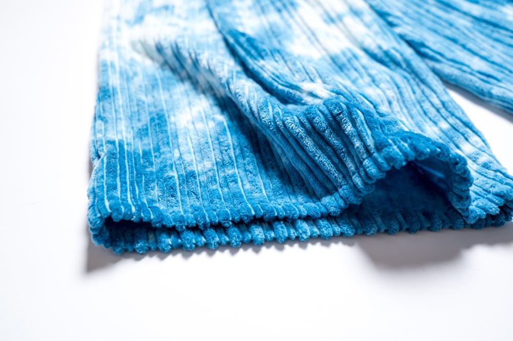 一点一点手仕事で絞り藍染したコーデュロイのワイドパンツ。