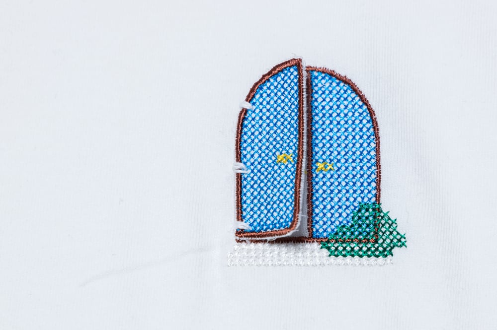 胸元には開いた扉の刺繍が刺しています。