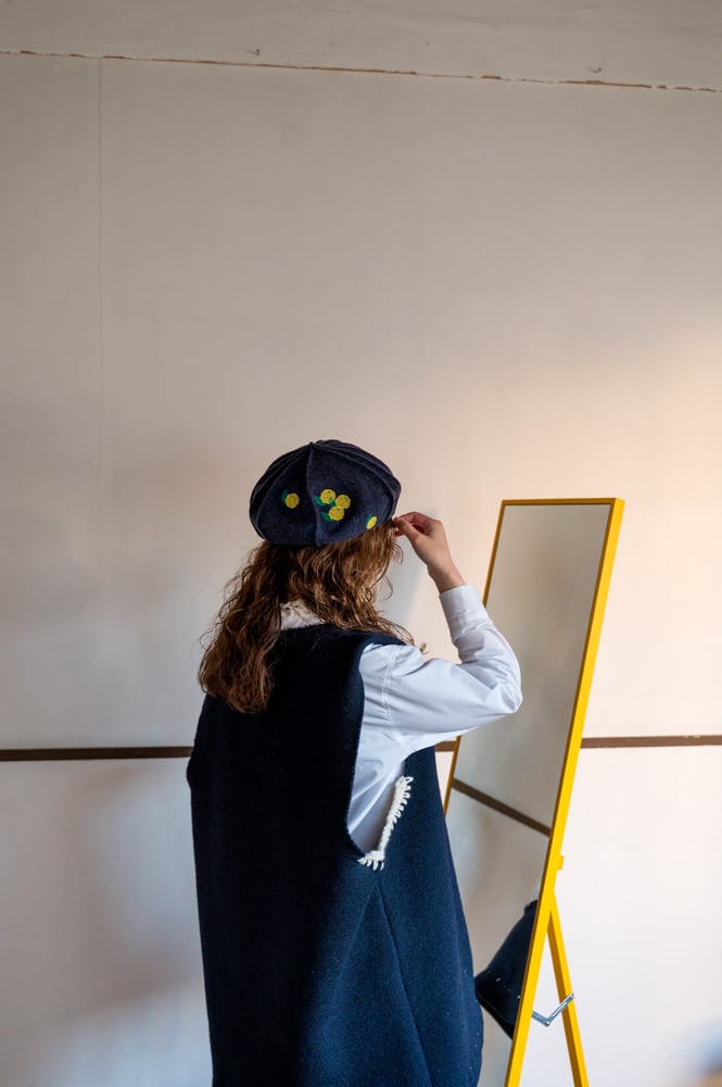 後ろに、斜めにずらしたり、その日の気分でかぶってみてください。